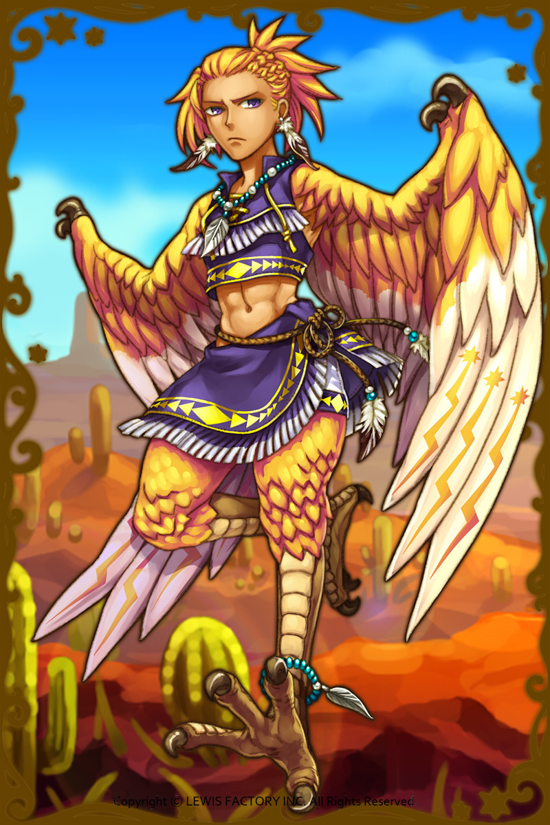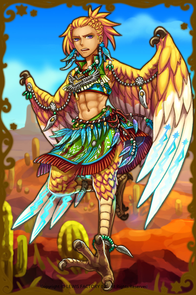- 羽を持って空飛ぶ神は多いが、オレの翼は力が強いことが自慢だが…聞きてぇってんなら特別に話してやってもいいぜ。この翼で巻き起こす風と雷は嵐みてぇなモンだ。人間は立ってられねぇだろうな!(親密度後半)