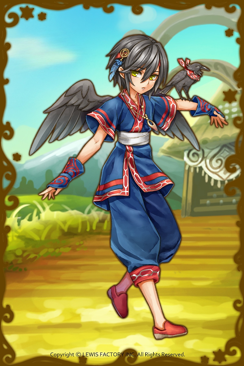 - 初期状態 :アイヌのハシボソカラスの神。頭の回転が早く、見かけとは裏腹に大人びた発言をする。面倒くさがりだが、なんだかんだ言って世話焼きなので、よく面倒ごとに巻き込まれてしまう。