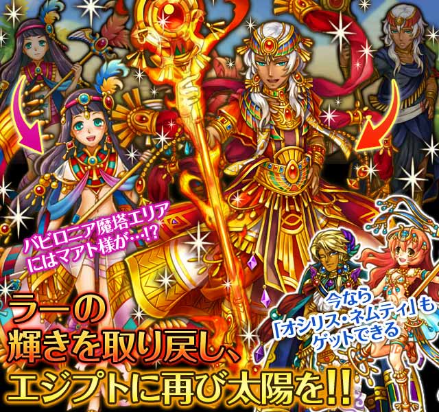太陽神ラー様が輝きを奪われ、魔神に封印されました!それを助けに未来から来たマアト様も時空を超える途中で捕まってしまったようです!魔神を倒してお2人を助け出しましょう!!