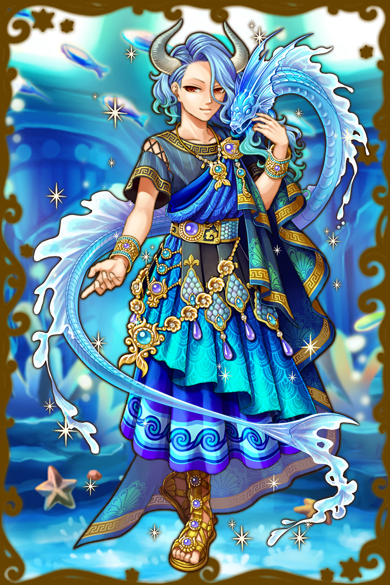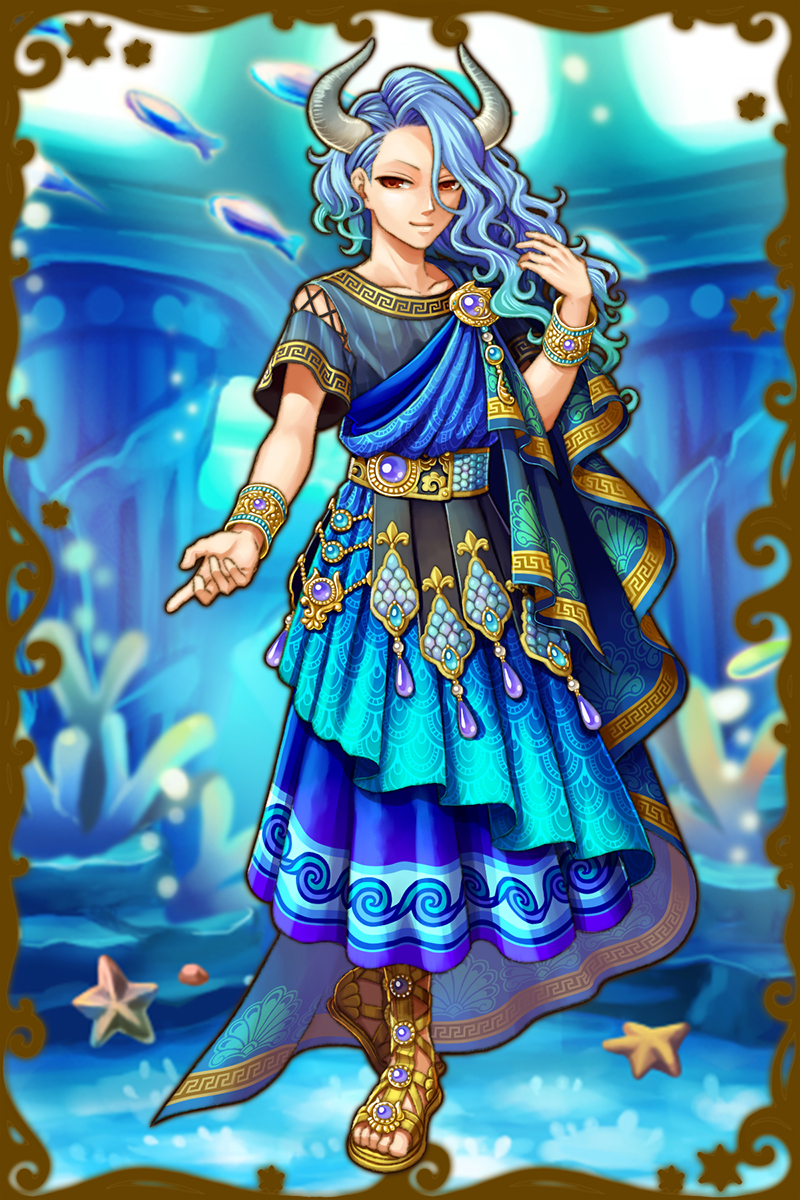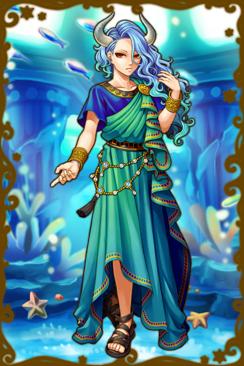 - あれ?…あれって、オケアノス?オケアノスにしては随分浮かれた格好してるな。…ああ、もしかしてあれかな、ステュクスにねだられたのかもしれないな。唯一、ステュクスには甘いし、あのオケアノスもステュクスには勝てないって聞いたことがあるからな…。涼しそうでいいとは思う。(親密度前半)