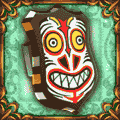 - この顔は南の島では魔除けの証。満面の笑みがなぜか怖いが、カモホアリイはよく見つめている。