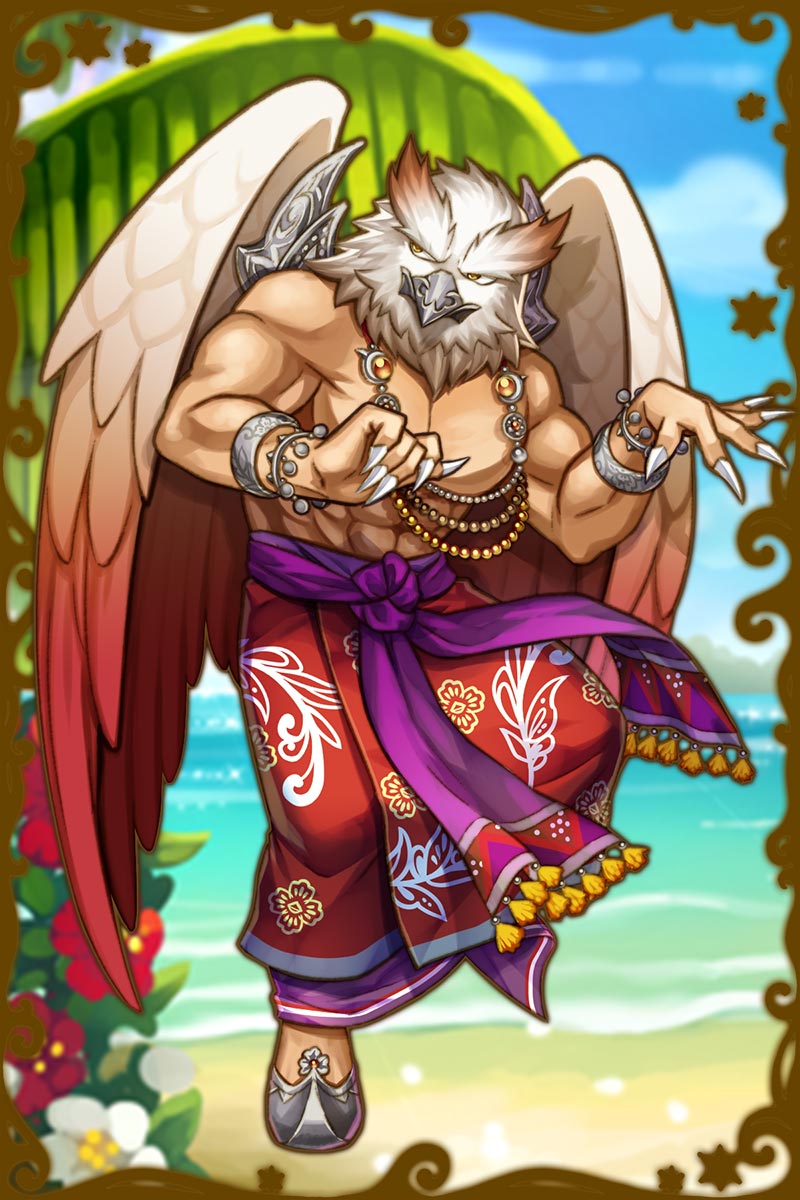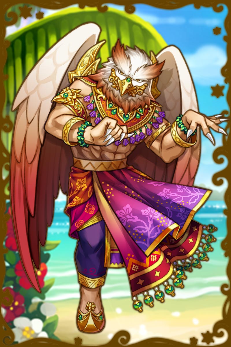 - 初期状態 :神鳥。インドにいるガルーダと関わりが深い。南の島を楽しみ、南の島の平和の為に力を使う。怖く見られがちだが実は心優しい。羽の手入れには鳥一倍気を遣っており、少々筋トレオタクな一面も持つ。