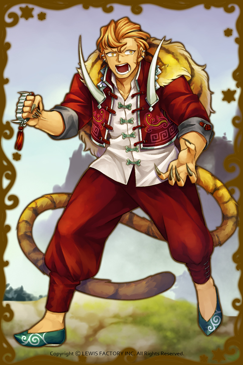 - この傷か?決まってんだろぉ、窮奇の野郎をぶちのめした時についた傷よ!…あぁ?!窮奇の野郎も俺様をぶちのめしたとかほざいてやがったのか!?あの野郎…ぶっ潰す!(親密度前半)