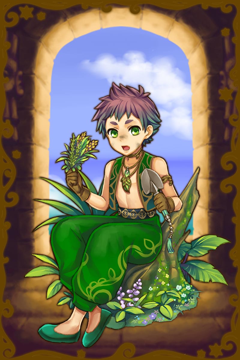 - なぁなぁ、アンタが探してた薬草ってこれだよなー?ちょうど見つけたから、とっといたぜ!わざわざお礼してくれんの?それなら、んーと…あっ!一緒に行きたい場所がある!珍しい植物がたくさん生えてるとこあるから、探検しに行こうぜー!(親密度後半)