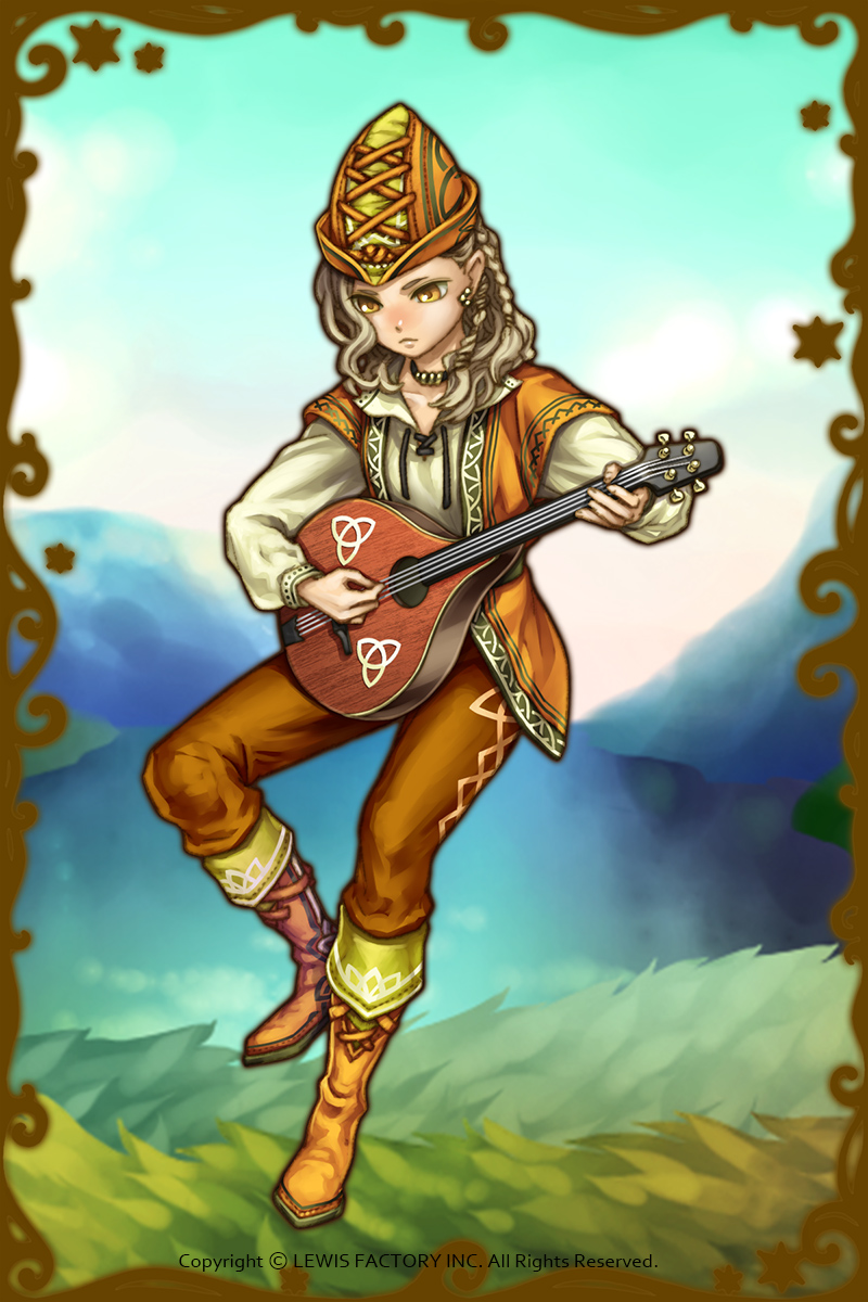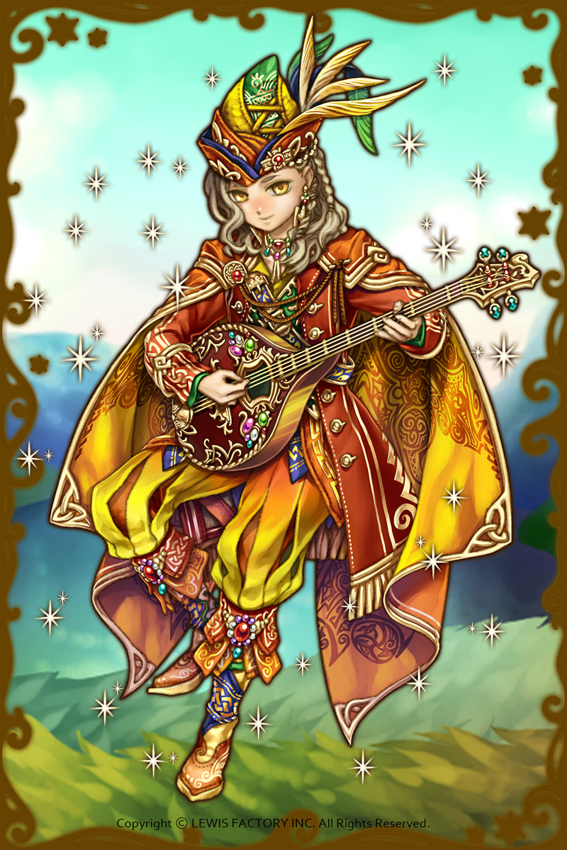 - 初期状態 :吟遊詩人であり、何かあるたびに歌っている。皮肉屋で素直ではなく、本音は歌に乗せている。処世術に長けているため、お世辞は得意。年上の女性によく可愛がられている。