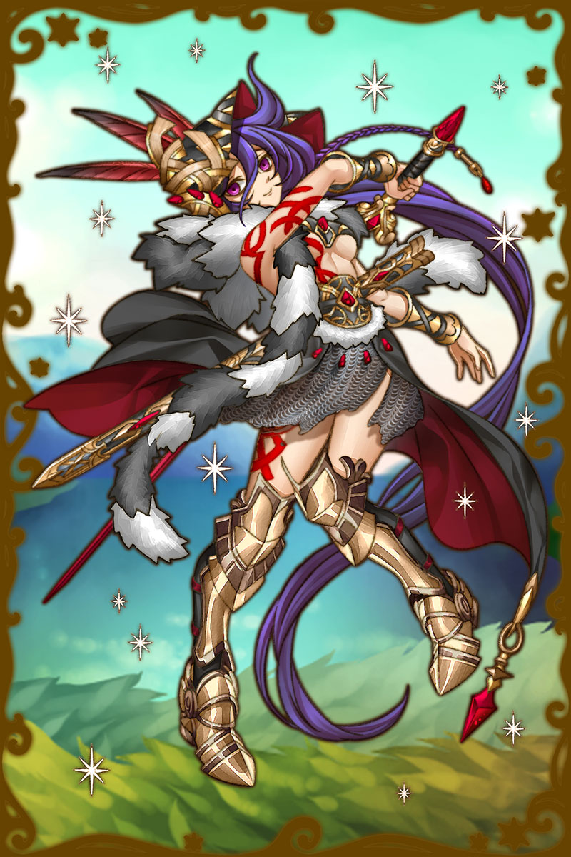 - 初期状態 :「戦いのカラス」の異名を持つ。戦場で死を予知する神であり、カラス姿になった彼女の叫び声は聞くものに恐怖を呼び起こす。巧みな剣技を扱い、何でも剣で解決しようとする。戦っているか、気に入った相手と一緒にいないとイライラしてしまう。気に入ったもの以外には興味がない。ヤンデレ。